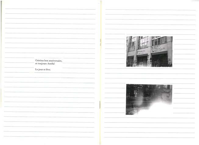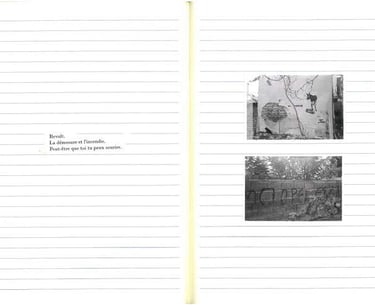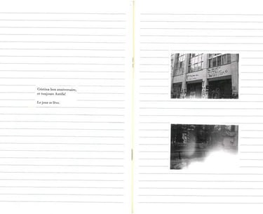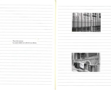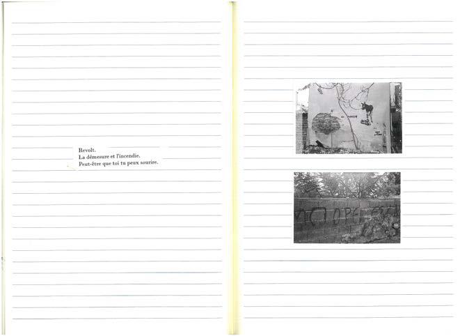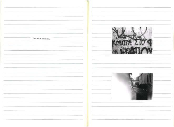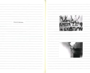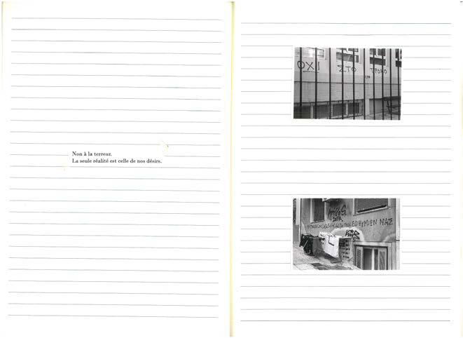 A notebook presenting 31 black and white photographs of inscriptions found in the streets of Athens. The images are accompanied by the translation of those words and phrases (from greek to french) forming a visual poem of urban writings.
