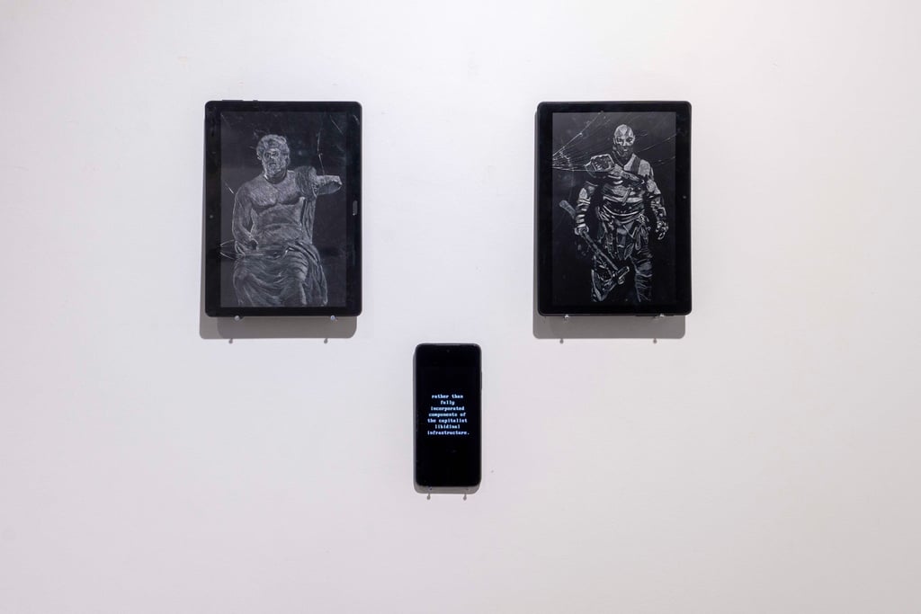 Bringing together broken electronic devices, Zeus' severed hands and digital gods waving axes, the installation investigates notions of historicity, technology and obsolescence.