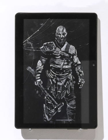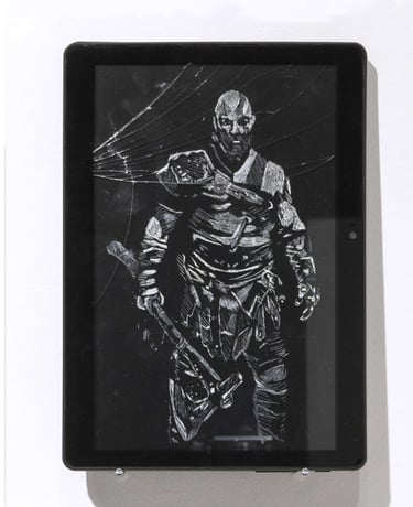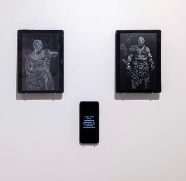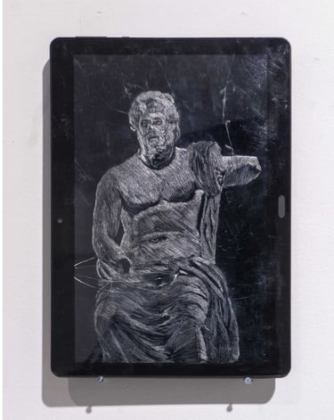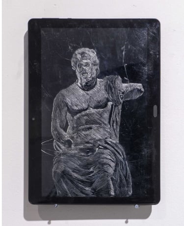 Hands Up is a multimedia installation consisting of two engraved tablets and a looped video on a cellphone. Figures of power, both ancient and contemporary, are etched on tablets accompanied by a video displaying quotes by Mark Fisher’s essay Terminator vs Avatar, (2012).