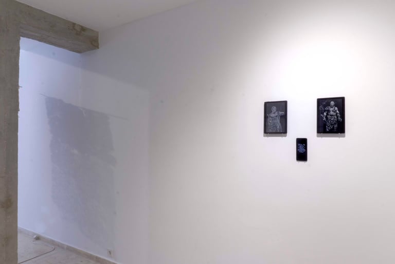 "The work of Fiona Elli Spathopoulou (Athens, 1989) interrogates the labyrinthine relationship between technological media and madness, exploring how technological and cultural frameworks influence our ways of perceiving and experiencing reality. Her practice engages with the psychological fractures that emerge in a world dominated by hyper-connectivity and mediated representations. Together, Galanis and Spathopoulou construct multi-layered visual dialogues. Their work challenges conventional notions of time, space, and cultural continuity, reflecting our era's instability while proposing new ways of inhabiting its fragments. Their practice recontextualises familiar narratives by incorporating references to classical antiquity and contemporary digital culture. Figures from antiquity interact with avatars of modern media, unravelling the tensions between tradition and the algorithms of an ultra-accelerated world."