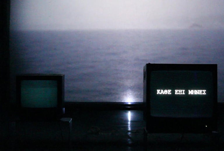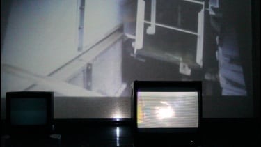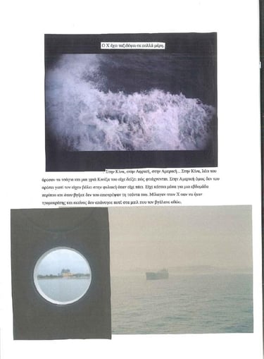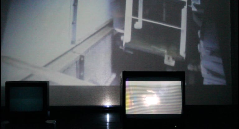 X.SAYS is an installation comprised of 5 monitors and one projection, functioning as a machine producing speech and images in a fragmentary conversation between two people, one in the engine room of a container ship, the other in a bedroom, trying to interpet the information recieved. The monitors and projection function as internal screens that unfold in time mental procedures, impossible dialogues and intenral monologues.